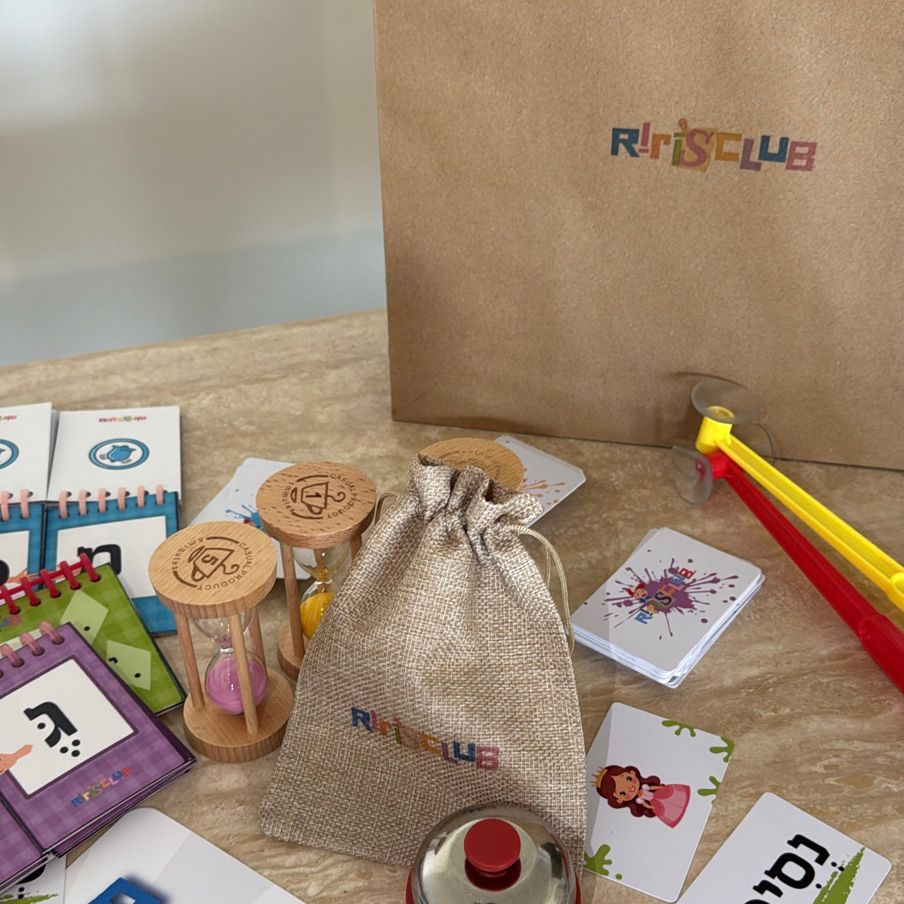 📌 3 שעוני חול מעץ בזמנים: דקה, 3 ו5 דקות, כדי להוסיף אתגר למשחק ולעודד קריאה מהירה.